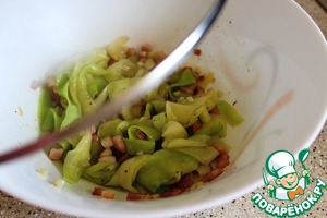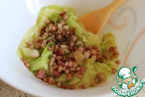 Соединяю бекон с кабачками, солю, перчу, сбрызгиваю лимонным соком, добавляю горчицу.