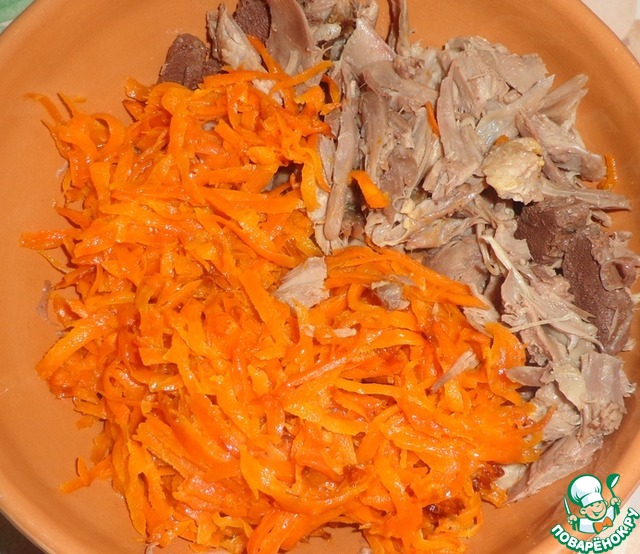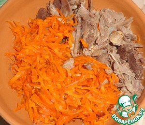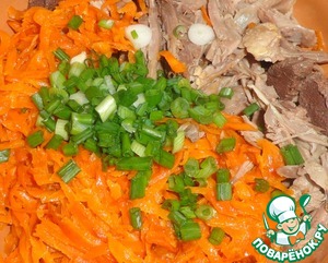 Очень сытный и вкусный салатик из отварного мяса и тушеной моркови.
