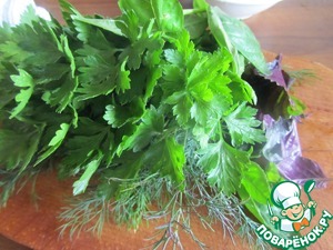 Зелень по вашему вкусу - измельчить. У меня петрушка, укроп и базилик.