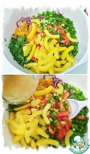 Соединить все овощи и зелень, полить заправкой и перемешать.