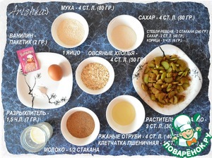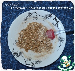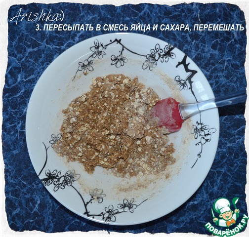 В другой миске смешать 4 ст. л. муки, 4 ст. л. овсяных хлопьев, 4 ст. л. ржаных отрубей, 1 ст. л. клетчатки, 1,5 ч. л. разрыхлителя и пакетик ванилина