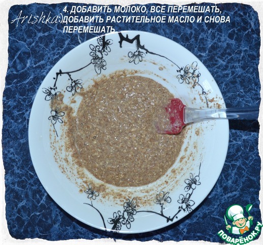 Добавить 0,5 стакана молока, все перемешать, добавить 3 ст. л. растительного масла и снова перемешать.
