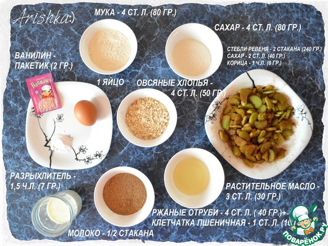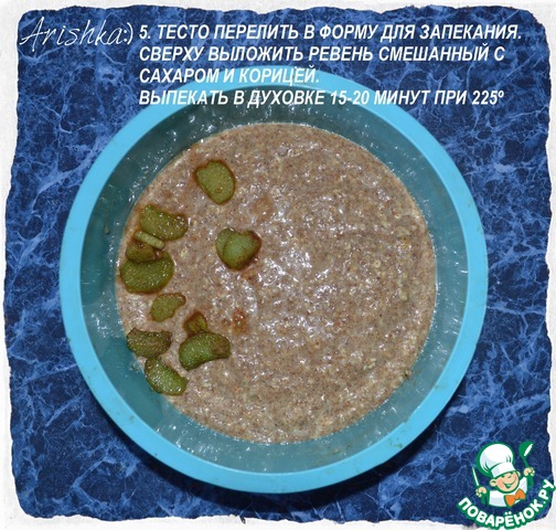 Тесто перелить в форму для запекания. Ревень нарезать кубиками толщиной 5 мм, смешать с сахаром и корицей. выложить на тесто.
