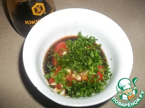 Добавить нарезанные чеснок и свежую зелень, 2 ст. л. соевого соуса,