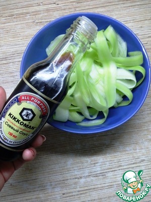 Сложить полоски в тарелку и добавить соевый соус. Перемешать и оставить на полчасика мариноваться.