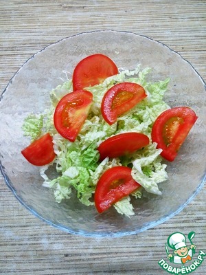 В салатник порезать пекинскую капусту. Салат можно делать порционно или в одном большом салатнике. Я делала порционно.