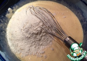 Яйца взбиваем, добавляем кефир, майонез (он сделает пирог очень нежным!!!), разрыхлитель и муку.