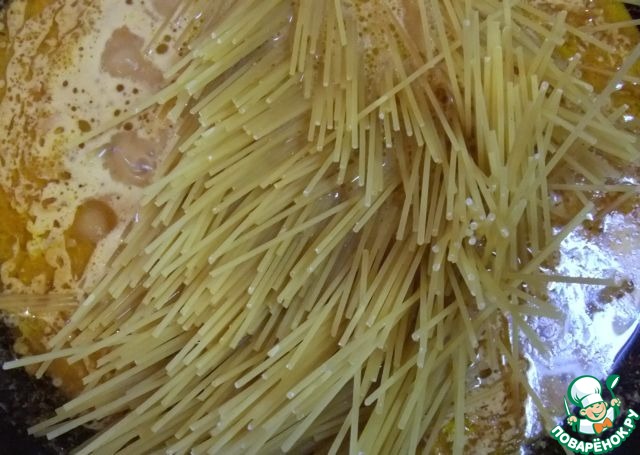 Спагетти поломать на три части. Можно не ломать, просто я не люблю мучаться с длинными.