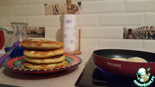 Жарить на среднем огне в растительном масле без запаха с двух сторон до румяной корочки. Пирог сильно поднимается.