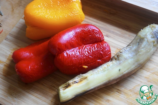 Противень застелить бумагой для выпечки и выложить на него вымытые и обсушенные бумажным полотенцем перцы и баклажан. У чеснока обрезать верхушку и завернуть в фольгу, положить на противень. Духовку разогреть до 200 град. и запечь овощи около 30 минут до готовности. Затем вынуть из духовки. Переложить баклажан и перцы в кастрюлю, накрыть крышкой и дать постоять около 20 минут. Затем очистить овощи от кожицы, сделать это будет легко.