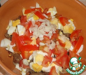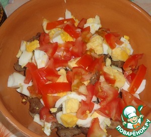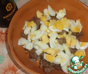 Отварные яйца очистить и порезать крупными кусочками. Яйца добавляем к остывшему мясу.