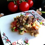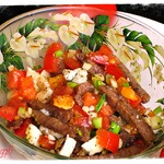 Сытный мясной салат с овощами и соевым соусом.