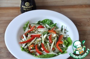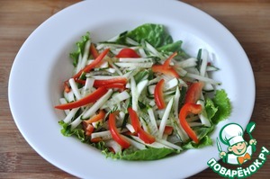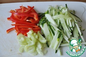 • Берём болгарский перец, черешковый сельдерей и огурец. Всё режем соломкой.