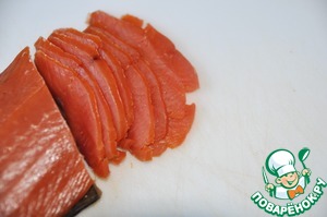 Рыбу, у меня боковина кеты, режем тонкими ломтиками.