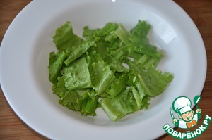 • Берём глубокую тарелку, на дно рвём или режем помытые и обсушенные листья салата.