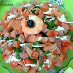 Красивый и вкусный салат с малосольный лососем быстрее съедается, чем готовится. Вкусный, оригинальный, красивый. И это все о нем. Настоящее буйство вкусов и ароматов, очень сочный и красивый - достойный подачи на праздничный стол. Все ингредиенты в нём идеально сочетаются между собой, что делает вкус просто незабываемым. Салат просто завершила кусочками рыбы. Спасибо, Светик, за изумительный вкус салата, нам было очень вкусно.