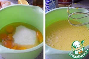 К яйцам добавим сахар и собьем миксером до полного растворения сахара и увеличения объема в 2 раза.