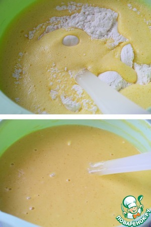 Всыпаем просеянную муку и вымешиваем тесто (оно должно получится чуть гуще, чем на оладьи). Поэтому ориентируйтесь по своей муке: может данного количества хватит, если нет, то нужно будет добавить еще.
