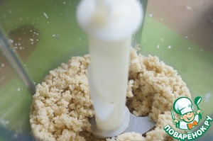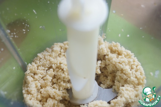 Для начала нужно приготовить песочную крошку. Для этого песочное печенье измельчаем при помощи блендера, добавляем сливочное масло и коньяк и перемешиваем в блендере.
