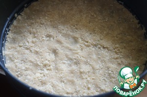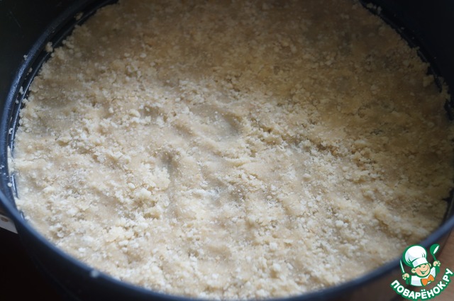 Берем форму со съемным бортиком и выкладываем песочную крошку в нее, распределяем по всей поверхности и утрамбовываем. Убираем пока в сторону.