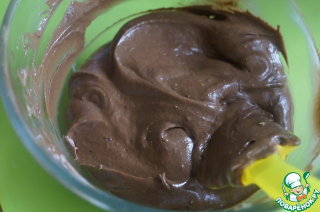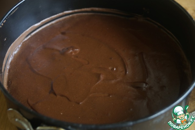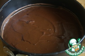 Теперь достаем нашу форму с печеньем и выливаем в нее шоколадный слой, ровняем лопаткой и ставим в разогретую до 160 гр. духовку на 30 минут.