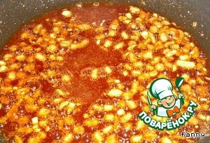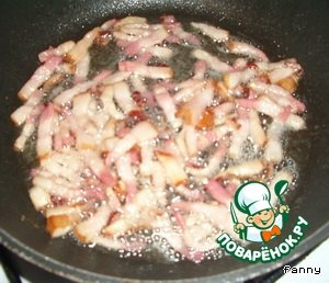 Со шпика срезать шкурку, нарезать его ломтиками чуть толще спички, поджарить до прозрачности в жире, вынуть и отложить.
