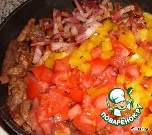 Когда все мясо станет почти мягким, положить в него нарезанные кубиками перец и помидоры, а также шпик, поджаренный в самом начале и тушить до готовности.