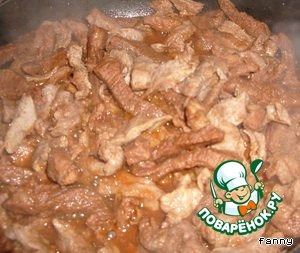 В получившемся жире поджарить мелко нарезанный лук, добавить в него паприку, быстро размешать, положить в него говядину, посолить ее и тушить до тех пор, пока не выпарится выделенный ею сок.