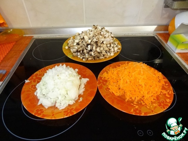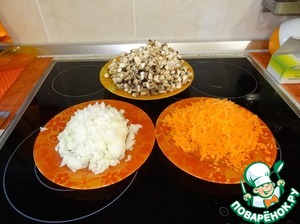 Чистим морковку, натираем на крупной терке. Лук режем кубиками. Грибочки тоже некрупными кубиками нарезаем.