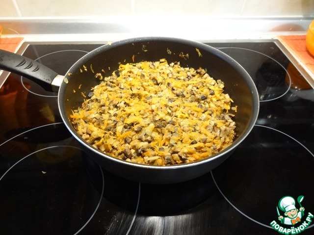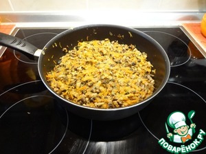 Жарим лук до золотистого цвета, затем добавляем к нему морковь и грибы. Жарим еще минут 5.