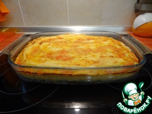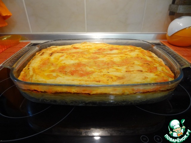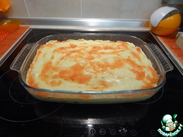 Слоеное тесто раскатываем. У меня было 2 листа. Смазываем форму маслом, первый лист лист укладываем в форму так, чтобы и бортики были закрыты. Выкладываем на него начинку. -