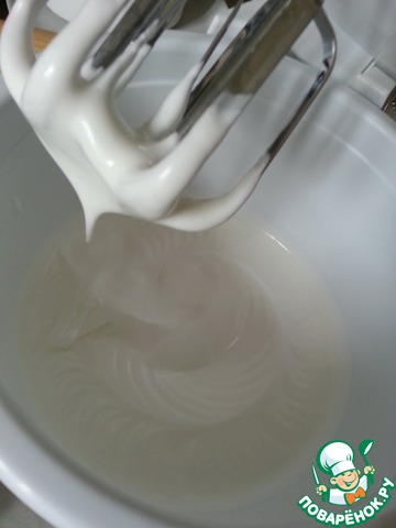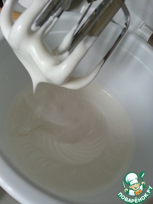 Для начала испечем корж безе. Очень ВАЖНО! Нагреть духовку до 100-110 градусов, если температура будет выше, то получится высокий неровный слой безе. Взбить 3 белка с щепоткой соли, 175 г сахара и лимонным соком.
