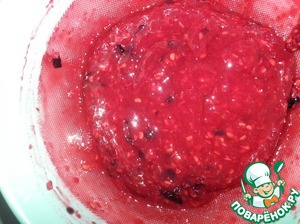 Замочить в 2 ст. л. воды желатин. Перебрать ягоду и из половины сделать при помощи блендера пюре, затем протереть через сито, чтоб избавиться от семян. Я делала на бис два варианта торта - с малиной и малина+смородина. Мне понравился с малиной, мужу - малина+смородина, он был с кислинкой.