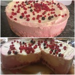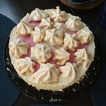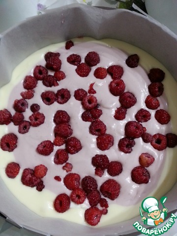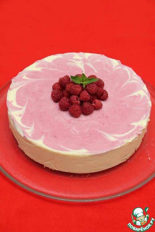 Разделить крем на 2 части. Перемешать с одной растопленный белый шоколад, а с другой - ягодное пюре. Отделите безе от бумаги, для этого, при помощи шпателя, немного приподнимите безе со всех сторон. Вместе с бумагой положите обратно в разъемную форму, выстелите бортики формы бумагой. Положите на безе белый крем, в середину выложите ягодный крем, посыпьте сверху оставшейся ягодой, утопите ягоду в креме и вилкой сделайте мраморный рисунок на креме, осторожно смешивая оба крема. Поставить в МОРОЗИЛКУ на 3 часа. Вынуть из формы, украсить по своему желанию.