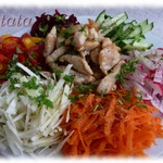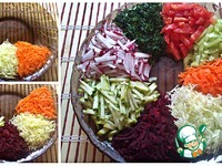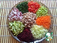 Вместо огурца-корейская морковь, перец взяла красный и желтый, вместо капусты -сыр. Сезон редиса уже закончился поэтому без него, свеклу сырую не едим.