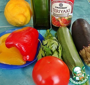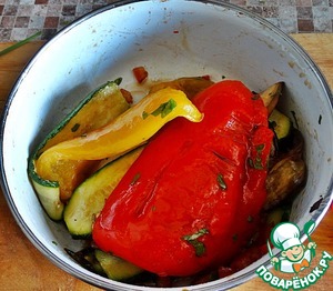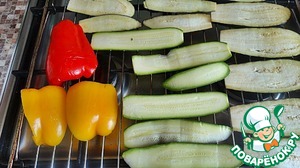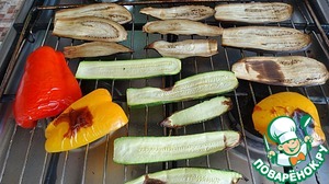 Баклажан и цуккини порезать вдоль тонкими слайсами, перец порезать полосками. и разложить все овощи на решётке. поставить в духовку под гриль на 10-15 мин. Проверяйте, чтобы баклажан и цуккини не подгорели. А перцы наоборот должны сильно запечься, чтобы можно легко снять кожицу.