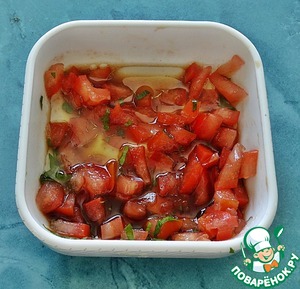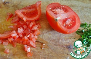 Помидор разрезаем пополам, освобождаем от семечек и стенки порежем на не очень большие кубики.