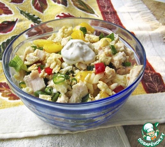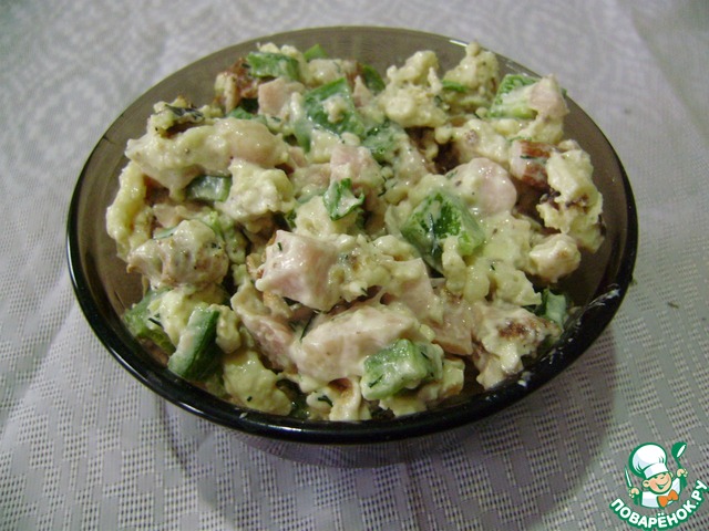 Копченый куриный окорочок отделить от кости и нарезать мелкими кубиками.