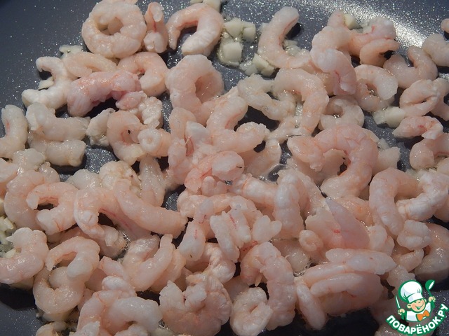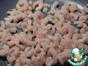 Чеснок измельчаем. Прогреваем его в разогретом масле на сковороде и добавляем креветки.