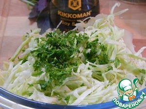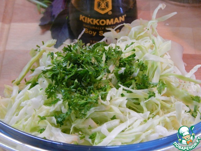 Капусту мелко шинкуем, нарезаем петрушку, добавляем к капусте. Перемешиваем и перчим. Добавляем лимонный сок.
