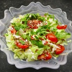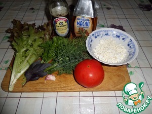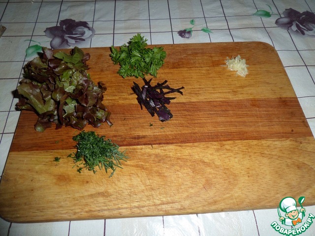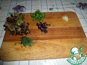 Измельчаем чеснок и нарезаем зелень. Листья салата можно порвать руками.