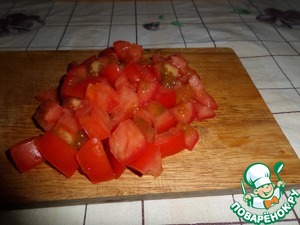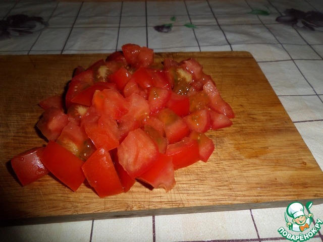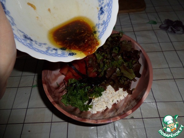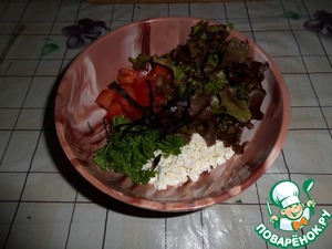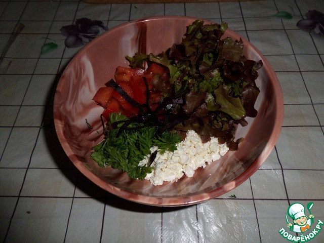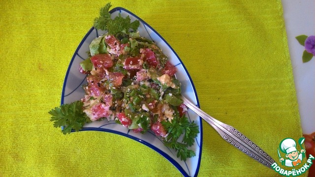 В чашку выкладываем творог, нарезанный помидор, зелень.