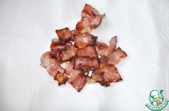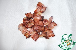 Готовый бекон кладём на бумажное полотенце, чтобы убрать остатки жира.