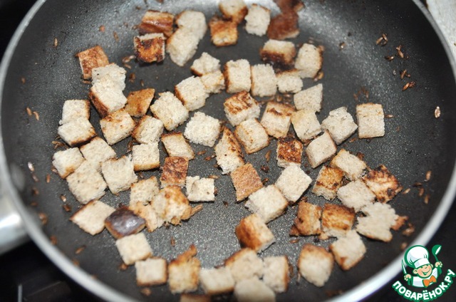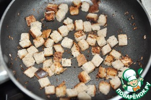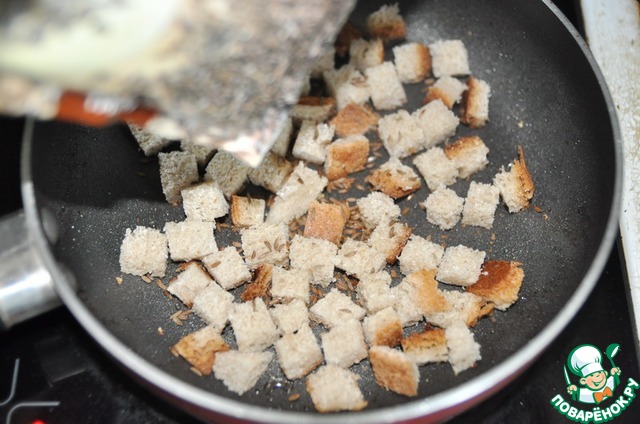 Хлеб режем мелкими кубиками и обжариваем на остатках жира от бекона вместе с семенами тмина. -