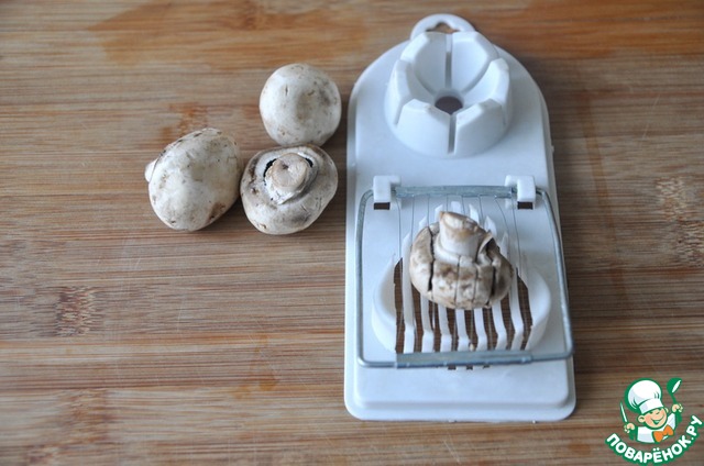 Шампиньоны моем, обсушиваем бумажным полотенцем и режем пластинками. Я подглядела нарезку с помощью яйцерезки.