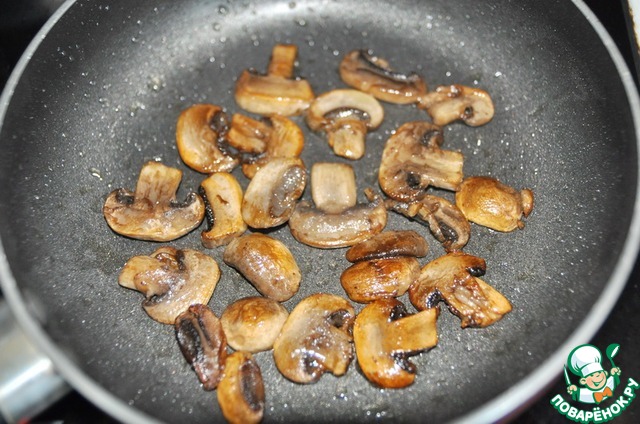 На сковороду наливаем 1 ст. ложку оливкового масла и обжариваем шампиньоны около 2 минут до румяности.