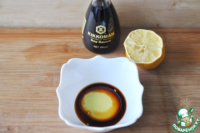 Готовим заправку из соевого соуса ТМ "Киккоман", оливкового масла (1 ст. ложка) и сока лимона.