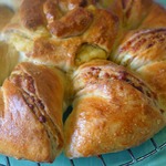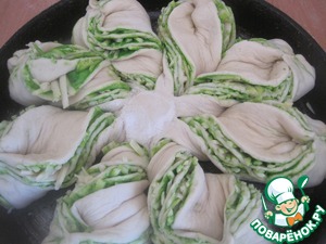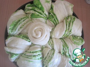 Вот, приготовила ваш пирог. Самое хлопотное оказалось измельчить зелень. Сок у меня потемнел и не был таким ярким, как у вас, но был очень ароматным. Использовала укроп, петрушку и зеленый базилик. Правда, получилось его мало и готовом пироге он почти не виден. Уголки у лепестков не соединила, рассмотрела этот нюанс на фотографии только сейчас, а в описании вы ничего не пишете на этот счет. Разрез сфотографировать не успела, пирог расхватали гости. Попробовать его свежим тоже не смогла по той же причине. Все унесли. Остался крохотный кусочек. На второй день он, к сожалению, зачерствел. Идея пирога мне очень понравилась, но тесто не очень. Обязательно попробую с другим дрожжевым тестом. В любом случае, большое спасибо за интересный рецепт.