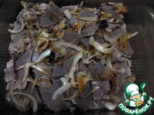 Язык очищаем от шкурки и режем мясо на мелкие брусочки толщиной 0,7-1 см. Укладываем их в форму для запекания. Можно посыпать хмели-сунели или другими любимыми специями.