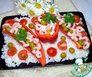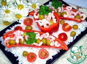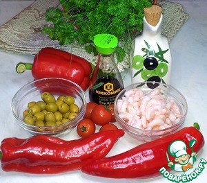 Болгарский красный перец, оливки начинённые сёмгой, креветки очищенные и варенные в кипящей подсоленной воде одну минуту, помидоры черри, соевый соус Киккоман, петрушка...